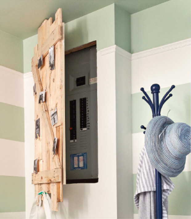 Esconder o quadro de luz com um quadro parece ser a solução mais óbvia. Para facilitar o acesso, podemos instalar dobradiças diretamente na parede (que só deve funcionar se a parede tiver o nivelamento perfeito, o que nunca acontece), ou sobre uma estrutura de madeira que emoldura o quadro de luz.